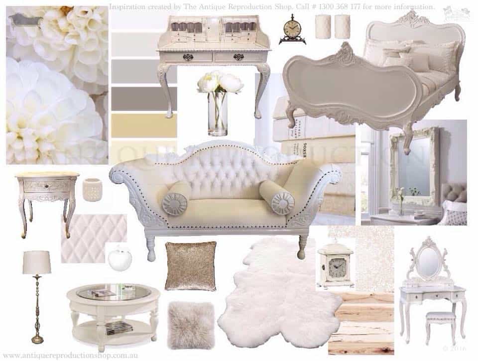 [vc_row][vc_column][vc_column_text]At the antique reproduction shop we are passionate about what we create and what we can offer our customers. We love to put together collections from around the world to show you what you can create. Here we have created a neutral luxurious stylish mood board compiling antique white finished furniture, neutral toned textural accessories and some old classics to take into a modern French revival.