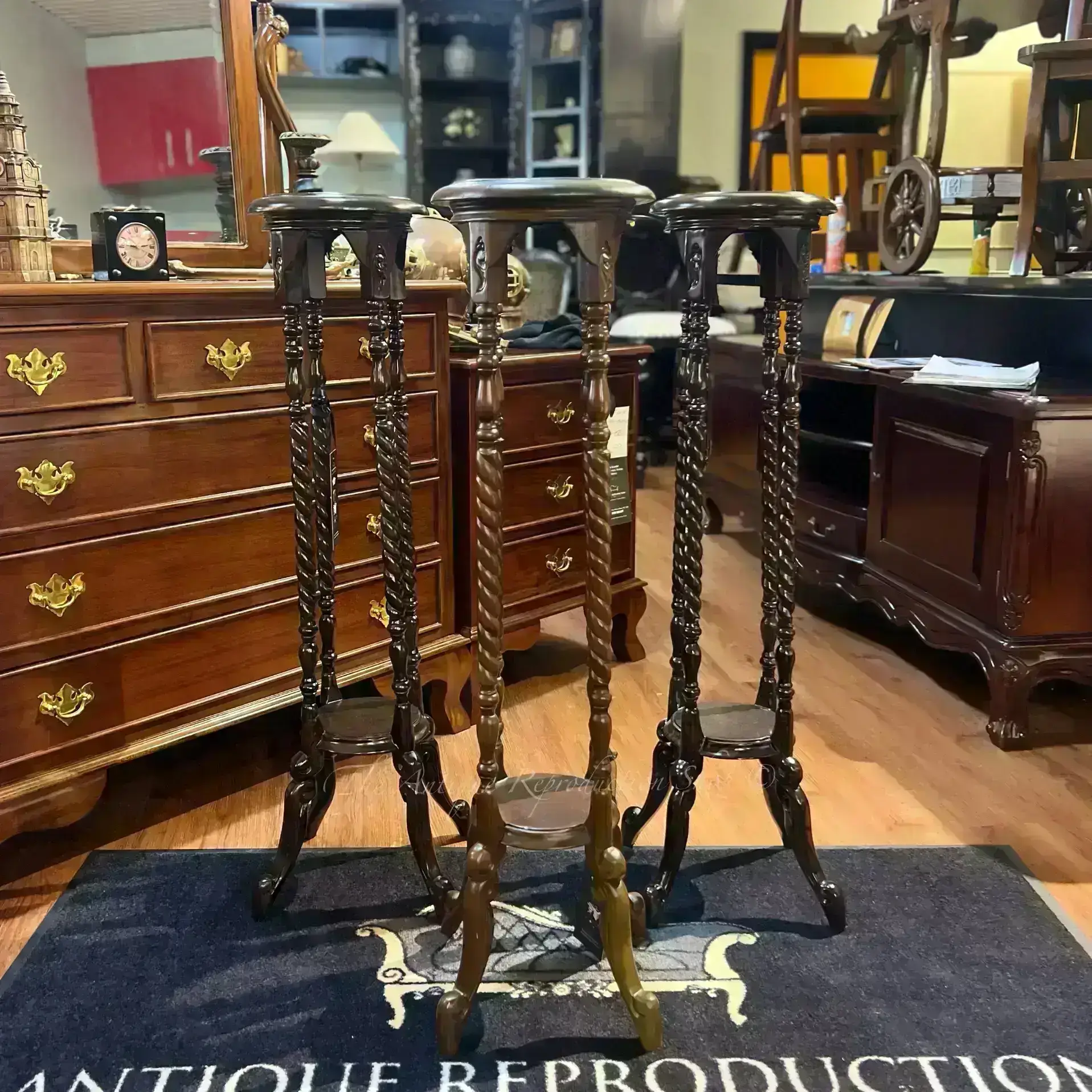 Part of our wonderful range of antique reproduction furniture is this little flower plant stand barley twist. Featuring barley twist carved detailing, and solid mahogany construction.