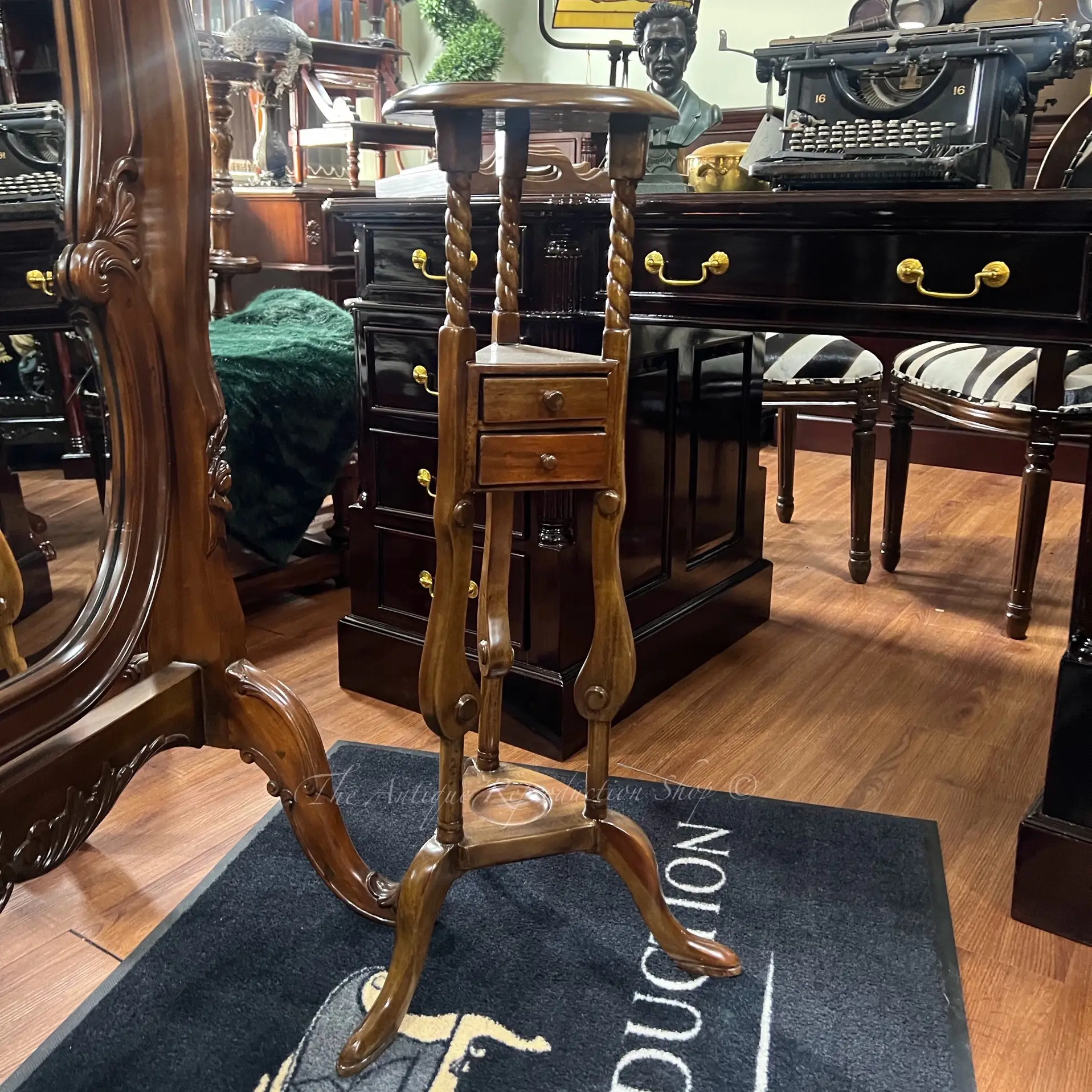 Part of our wonderful range of antique reproduction furniture is this flower pot plant stand 2 draw. Featuring carved detailing, 2 little draws and solid mahogany construction.