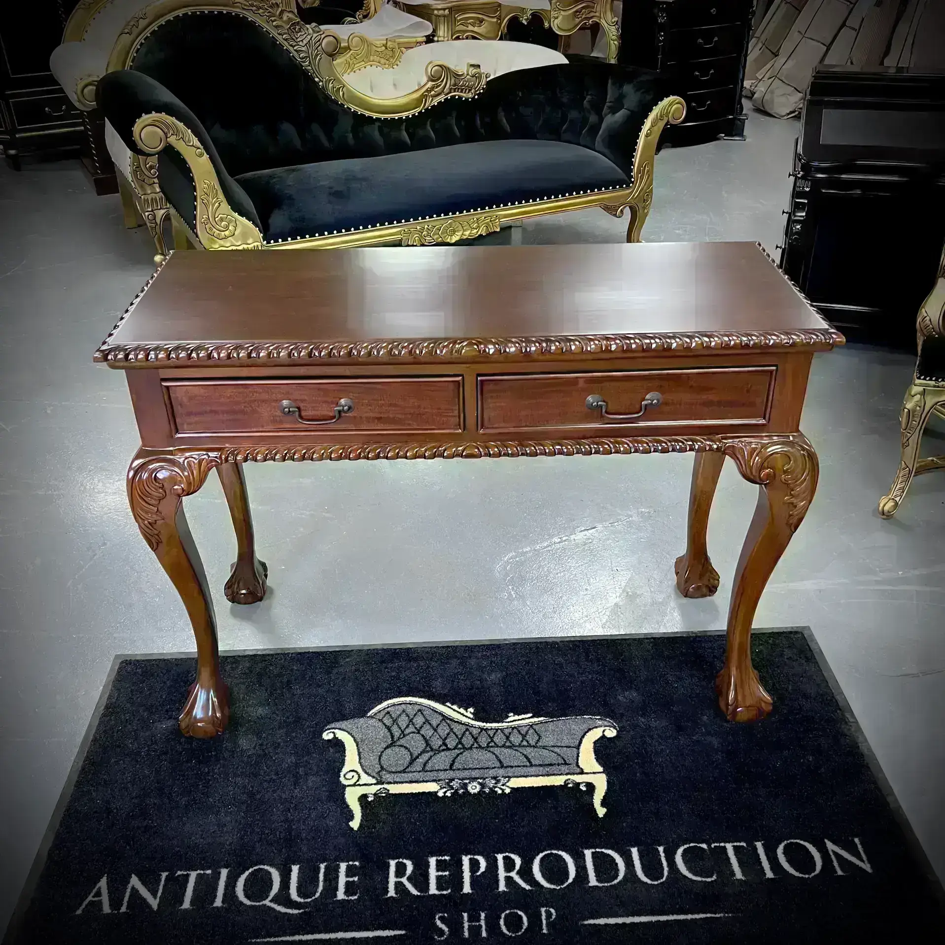 Part of our wonderful range of antique reproduction furniture is the gorgeous traditional Chippendale carved hall console table. This beautiful original victorian design wall hall table works perfect to create that opulent classic look. Featuring beautifully carved detailing, pie crust edging and solid mahogany construction. The perfect piece to add to your very own antique collection.