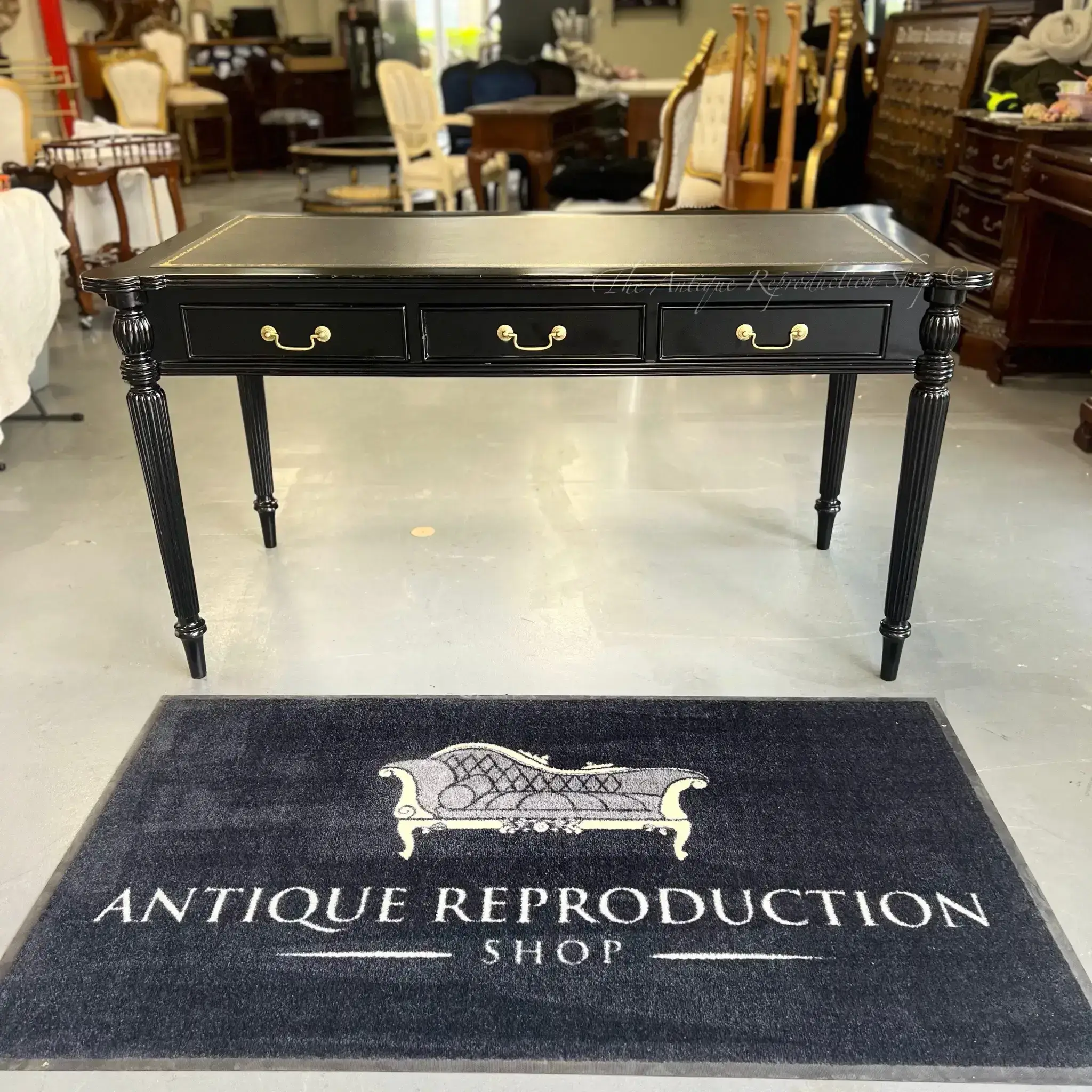 Part of our wonderful range of antique reproduction furniture is our Antique Reproduction 3 Draw Desk Writing Table. These beautiful original shaped tables with detailed empire design work perfect to create that old world charm. Featuring beautifully carved router detailing, signature flute legs, 3 draws with metal track runners, premium synthetic leather upholstery and solid mahogany construction.