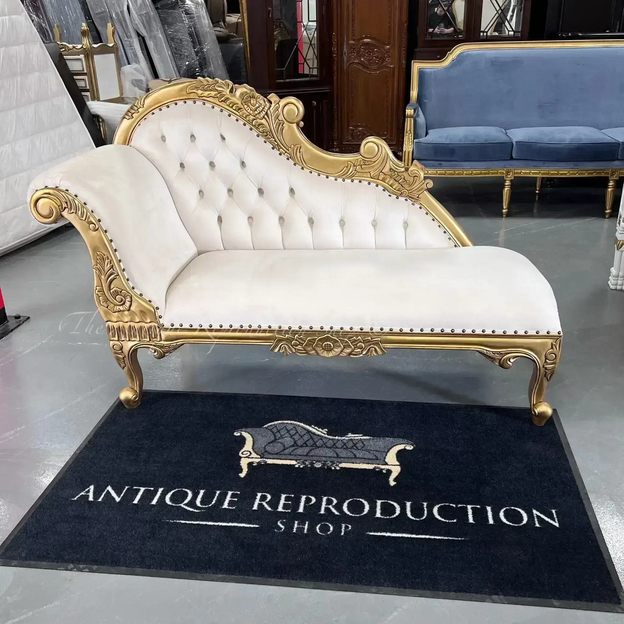 Part of our wonderful range of french provincial furniture is our gorgeous Mini French Provincial Chaise Lounge. You might call it a French Day Bed, Salon sofa, Chaise Longue or Love Seat. No one does these chaise like we do! We are the leading supplier for these amazing couches, the quality and detail is second to none. Featuring a left high end, beautifully carved detailing, french curved legs, diamond folded tufted buttoning and solid mahogany construction. A gorgeous chaise that your will be overly pleased with and will love for a lifetime #friendenvy