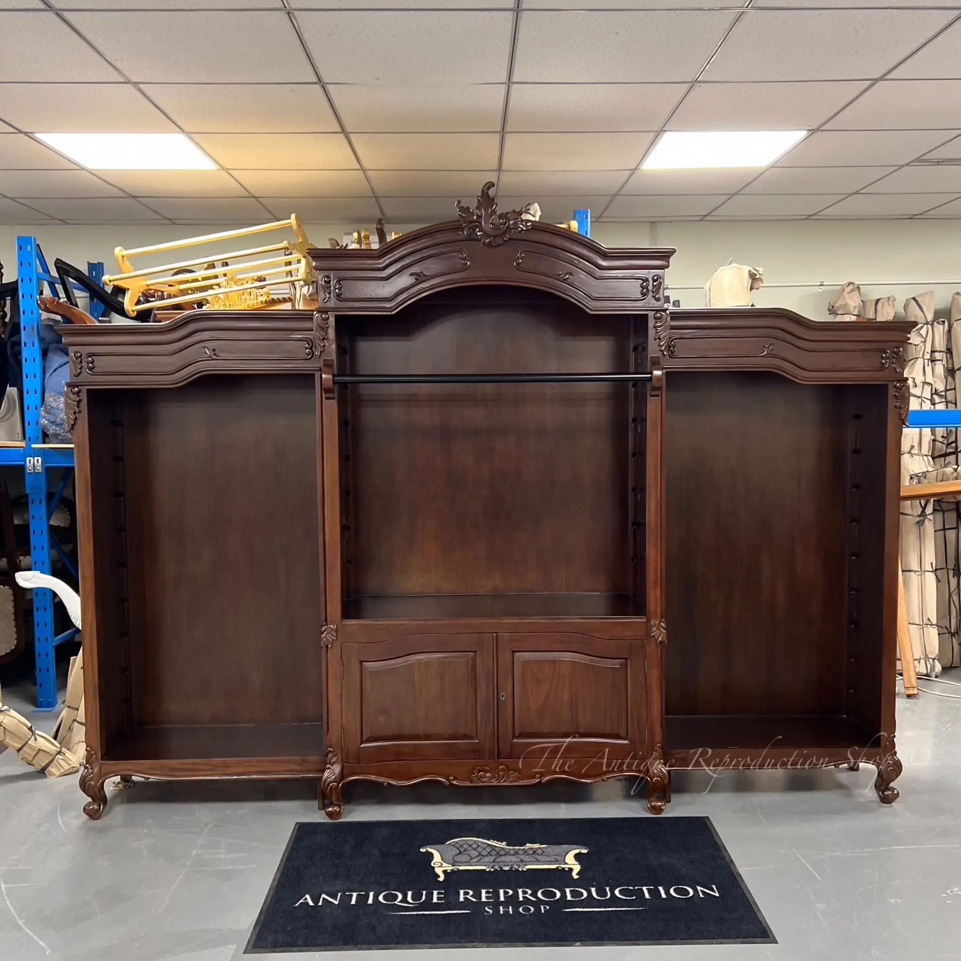 Part of our wonderful range of French provincial furniture is our lovely triple bookcase. Add a beautiful French provincial statement with this stunning bookcase. Featuring solid timber wooden shelving, 2 door cabinet for plenty of storage, beautiful detailed carvings with French turned feet, ladder and a solid mahogany construction, the perfect bookcase for office, home library, living room or bedroom.