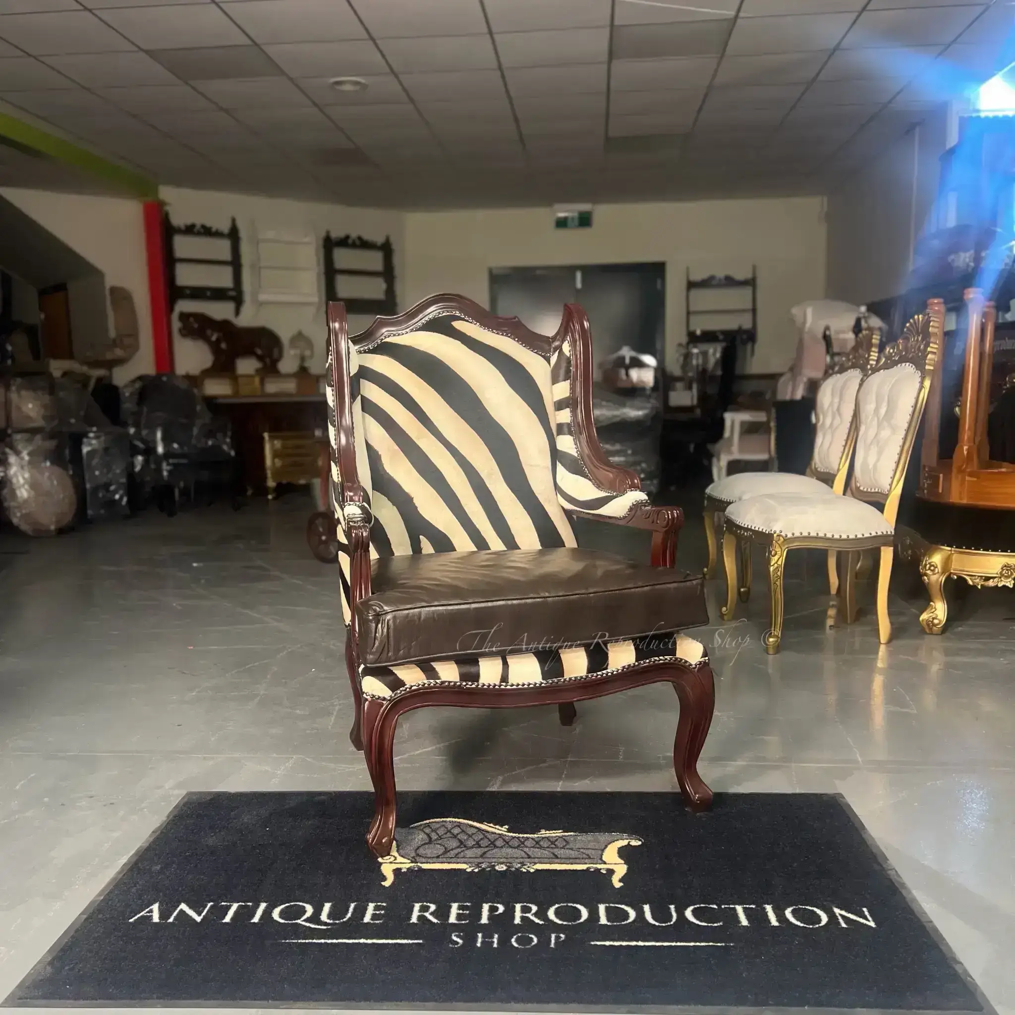 Part of our wonderful range of Georgian furniture is our zebra print wing chair. Featuring beautifully carved detailing, leather, zebra print cow Hyde and solid mahogany construction. A gorgeous chair that you will love for a lifetime.