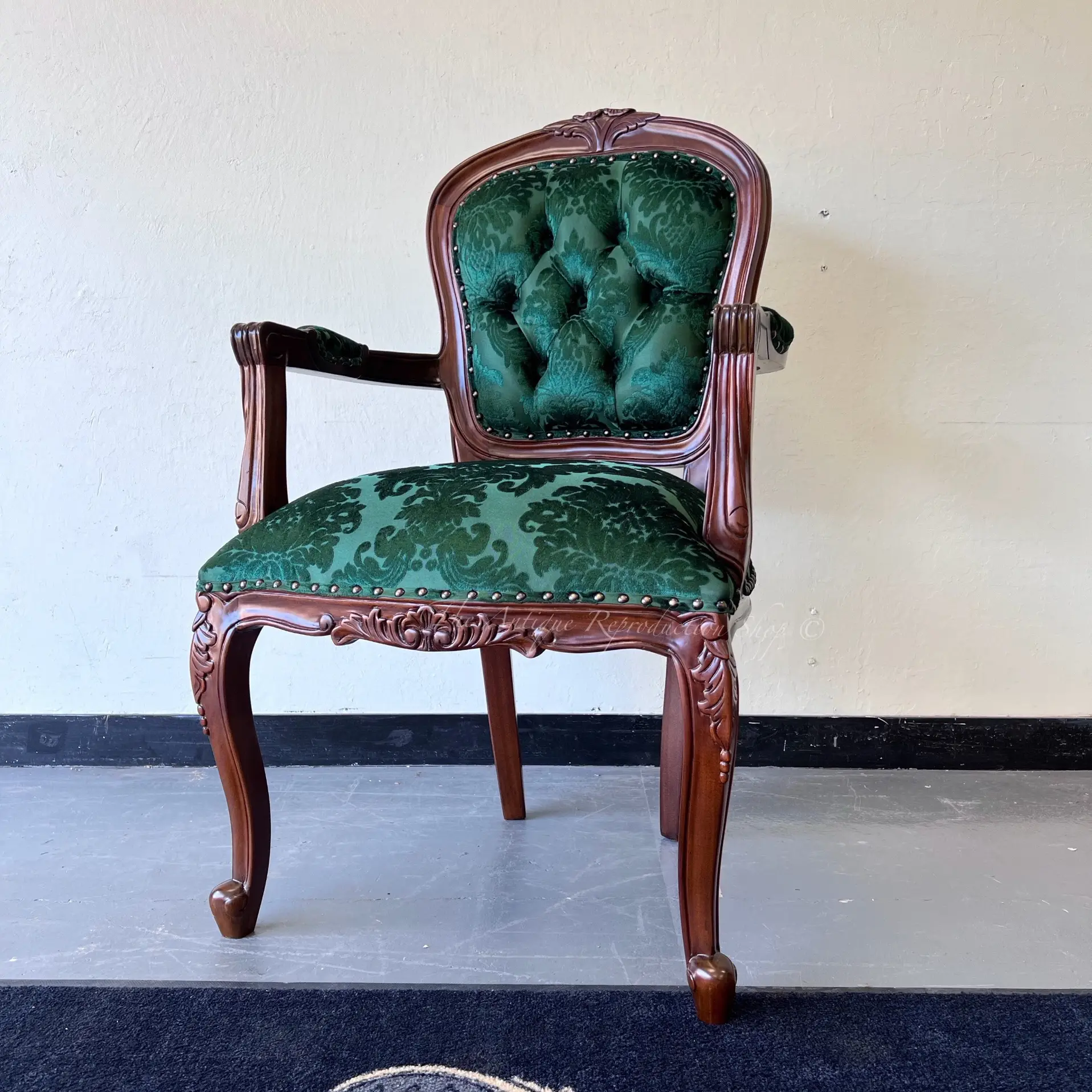 Part of our French provincial range these beautiful Louis style dining chairs with arms work perfect to create that characteristic french feel that we all want. This gorgeous chair features beautiful hand carved detailing, full upholstery with diamond folded tufted buttoning and is made out of a beautiful solid mahogany construction.
