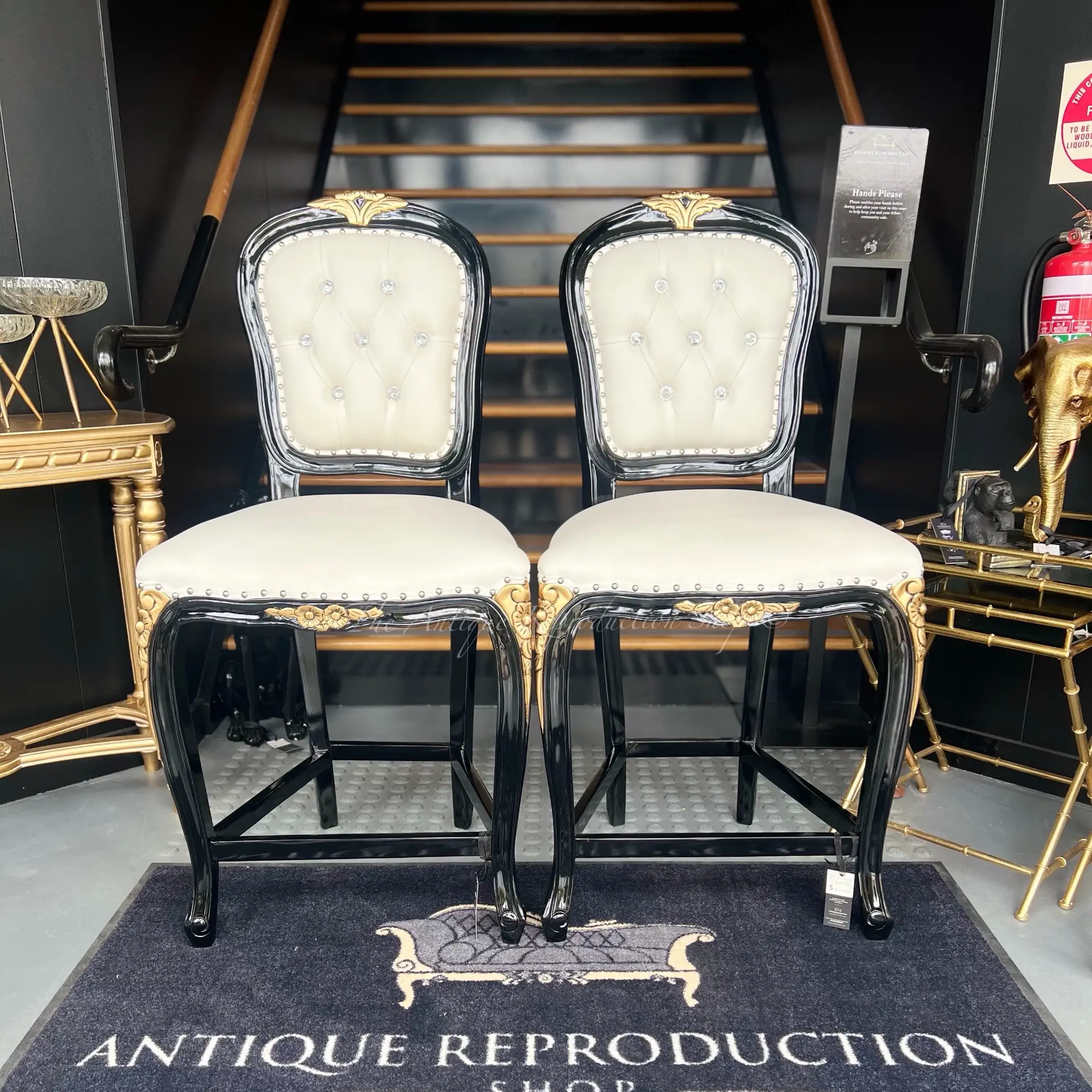 Louis Rose Carved Bar Stool Crystal Buttoning - Black With Gold Highlights