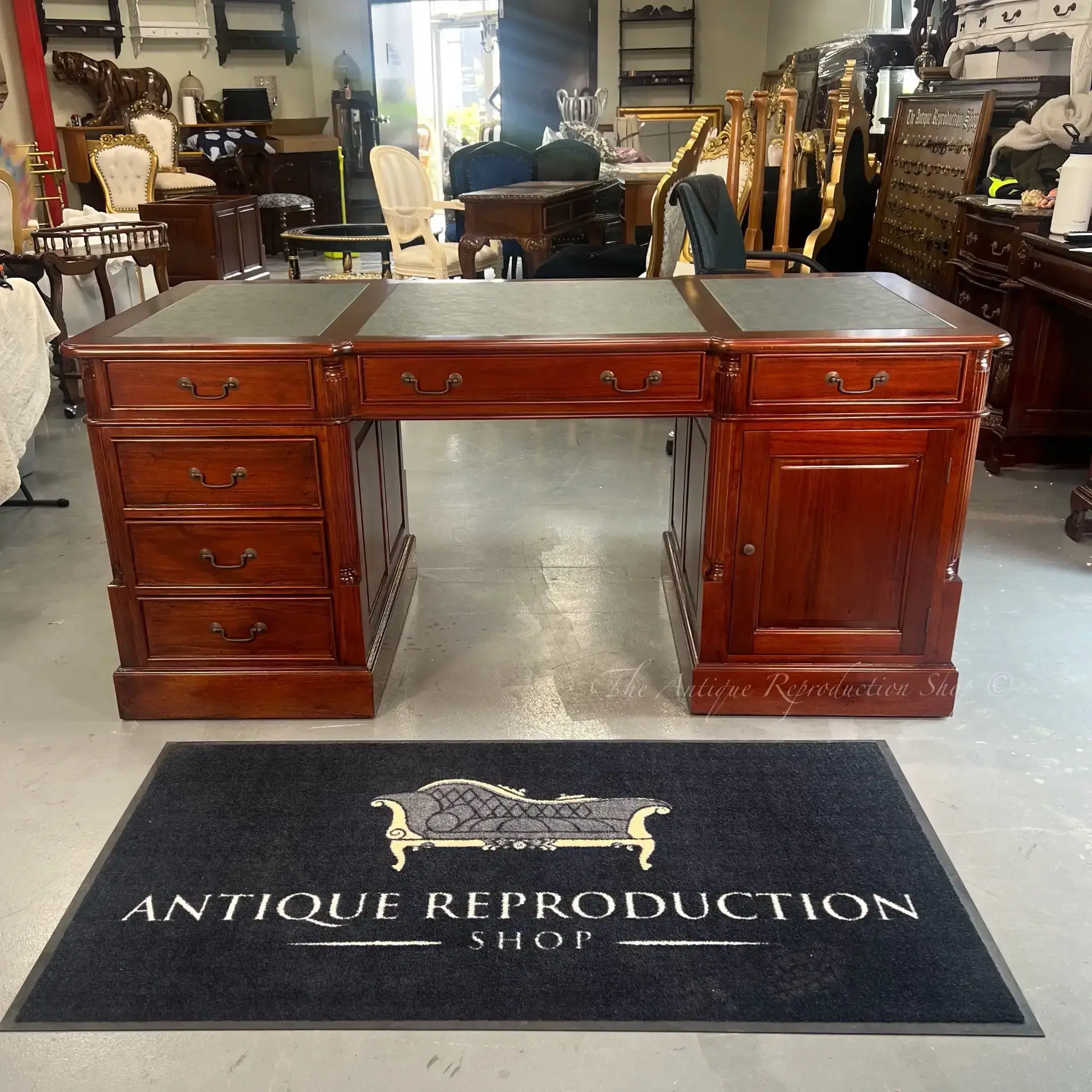 This tradition classic styled office partner's desk is a perfect replication of its antique heritage. This amazing writing desk is second to none! After selling and supplying our product Australia wide for over 20 years, we have perfected and refined to be the best possible quality for the best possible price. Don't be disappointed by a cheap imitation, buy from the best! This beautiful desk features classic design, doors and draws, 3 piece design for easy transport and solid mahogany construction. An opulent luxurious desk you deserve! We work hard to get where we are so work in style!