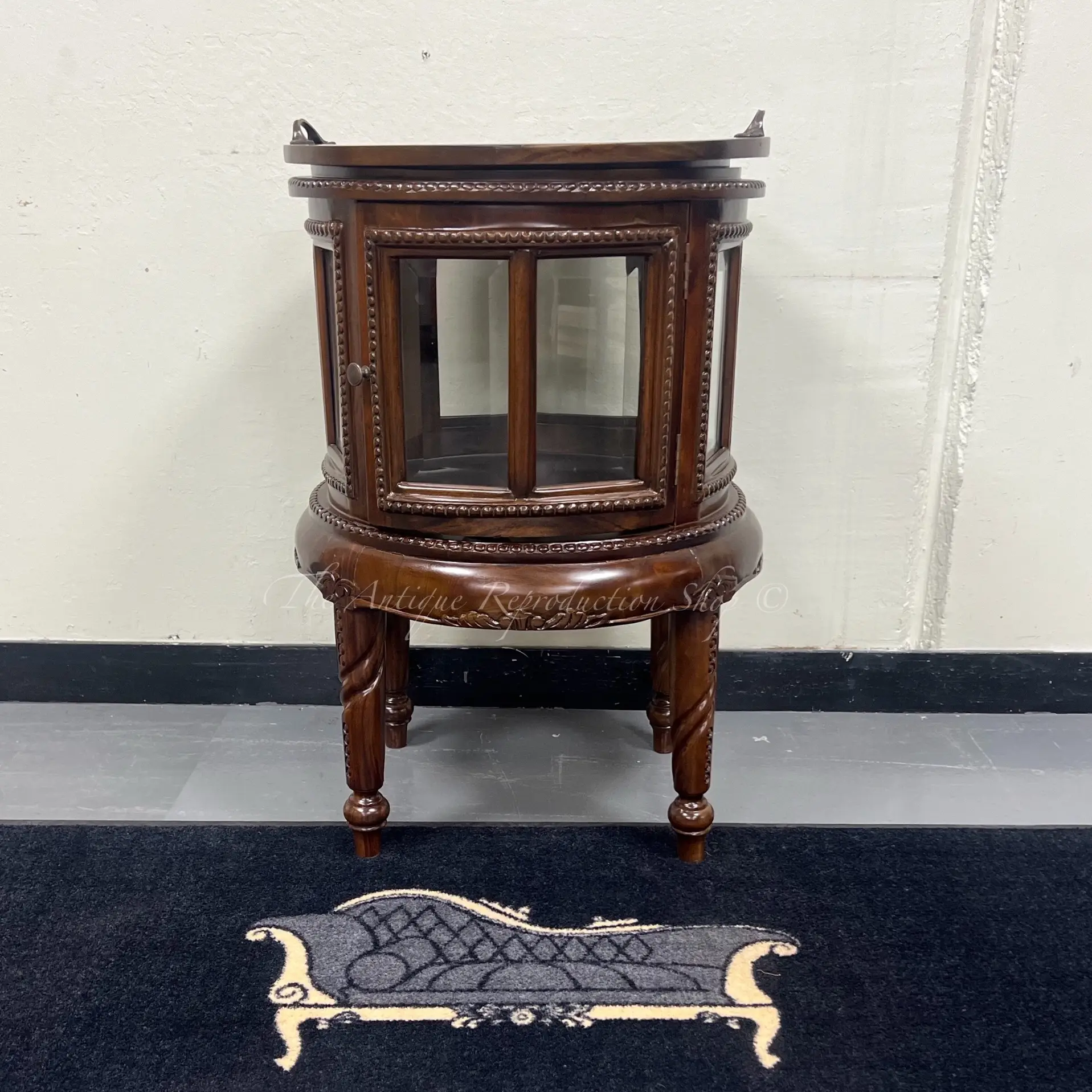 Part of our wonderful range of antique reproduction furniture is this little victorian style round shaped dumb waiter tea trolly with removable tray. This beautiful looking mini bar is full of character. Featuring beautiful carved detail, removable tray with handles and solid mahogany construction. This amazing little trolly is the perfect addition to your home, high tea party, dinner party, saloon, home pub, dining room, cocktail room, wedding, even at your front door!