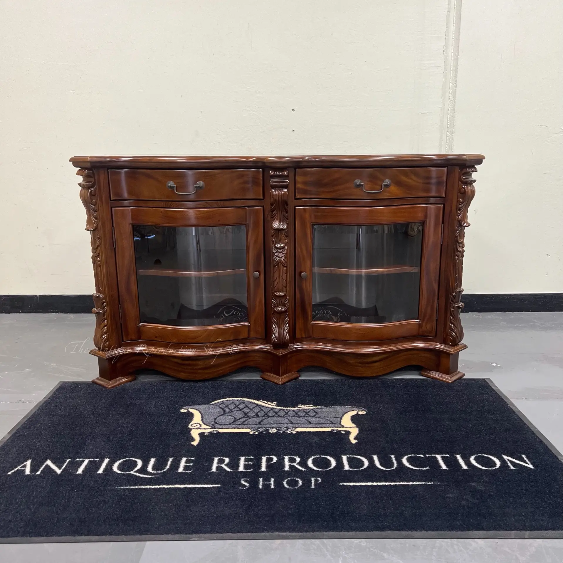 This gorgeous French provincial style entertainment Tv cabinet stand is a perfect solution for tidying up your area. This a classic French Provincial style will complete your classic style home. No more flat pack or modern tv cabinets, finish your home with one of our stunning customised cabinets. Featuring solid timber wooden shelving, beautiful detailed carving, 2 shelf cavities, 2 draws and solid mahogany construction. . Suitable cabinet for the lounge room, family room or bedroom.